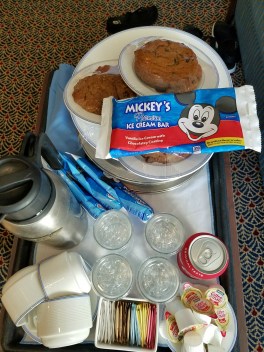Room service is also free of charge on Disney Cruises, just a little tip is appreciated for the attendant who delivers your goodies.Β We took advantage of ordering Mickey ice cream bars and chocolate chip cookies!